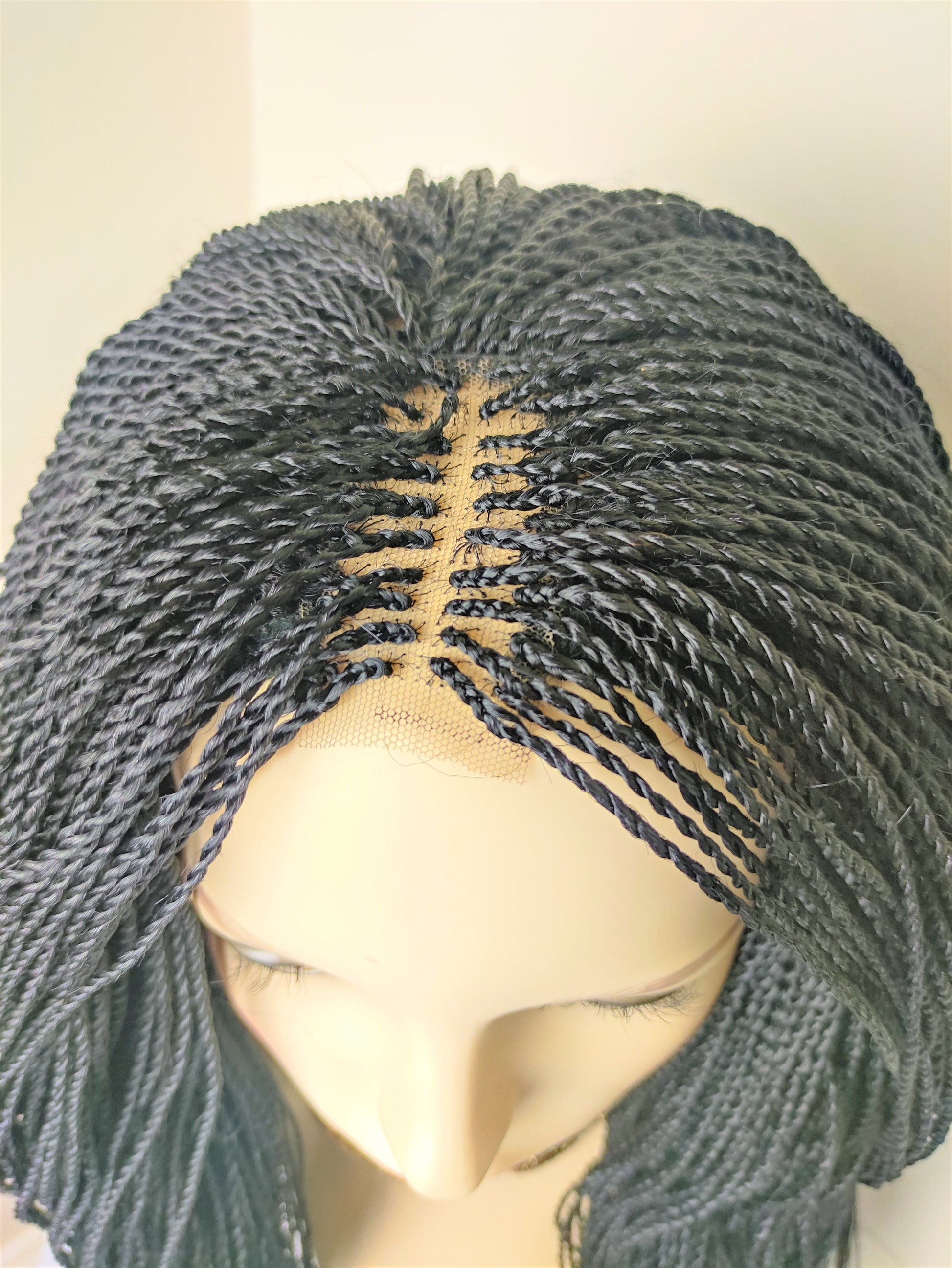This handmade black twist braids wig features a lace front parting that provides a realistic look and feel. It is made with quality materials and construction, ensuring a comfortable and long-lasting fit.