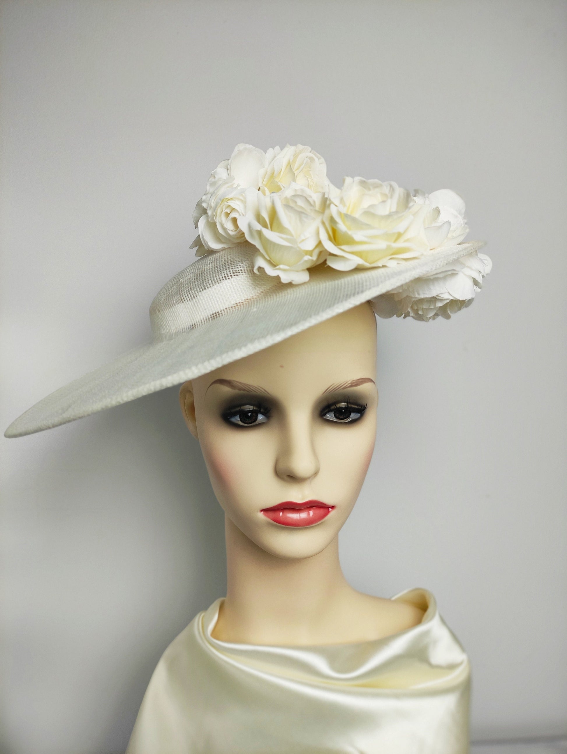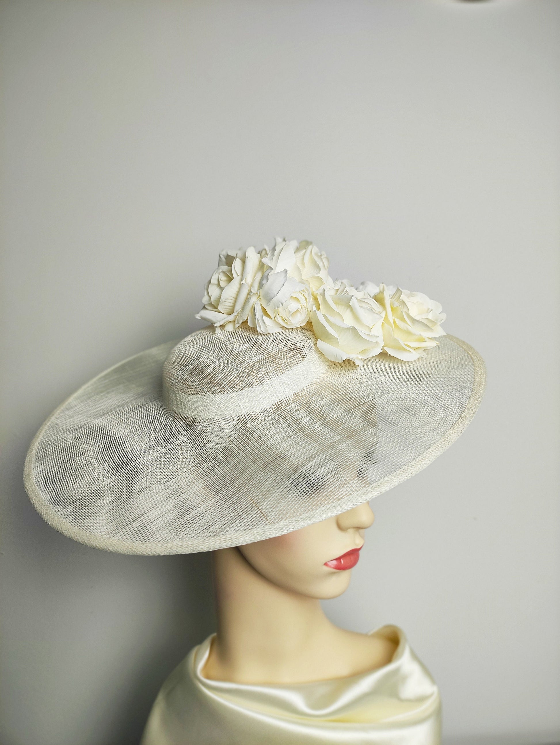 Elegant wide brim ivory hat embellished with soft fabric roses. It is attached to an ivory headband for a firm fit and shipped in its own box. Store the hat in its box after use to prevent stains.