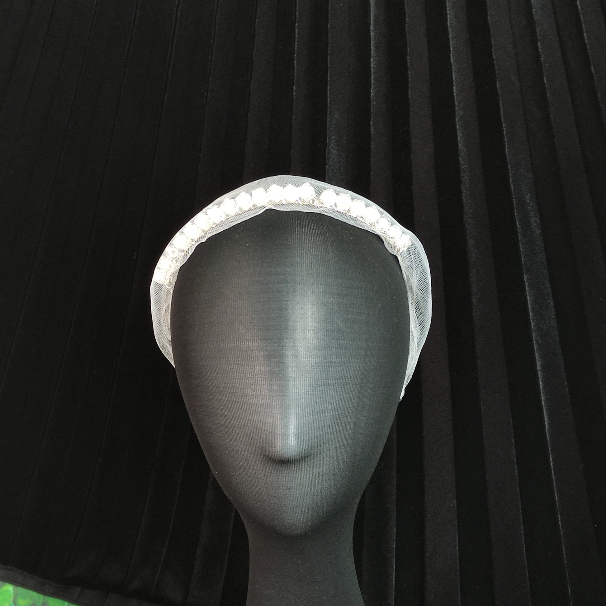 One off Light Hand wired white beaded scrunchie style hairband covered in netting.